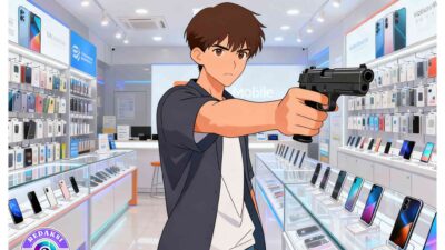 Gambar ilustrasi seorang pemuda menodongkan pistol mainan di toko handphone.(foto:ilustrasi)